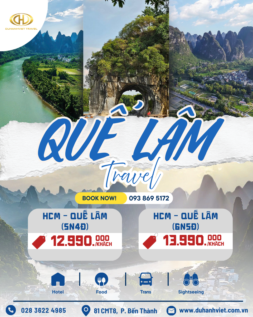 Theo giờ hẹn, đoàn tập trung tại sân bay để khởi hành đến Quế Lâm theo chuyến bay SGN-KWL VJ3692 14:15-18:00. Nơi non nước hữu tình tựa như bức tranh thủy mặc. Đến nơi, đoàn làm thủ tục nhập cảnh, sau đó lên xe di chuyển về trung tâm thành phố ăn tối (khoảng 1h đồng hồ). Nhận phòng khách sạn và nghỉ ngơi.